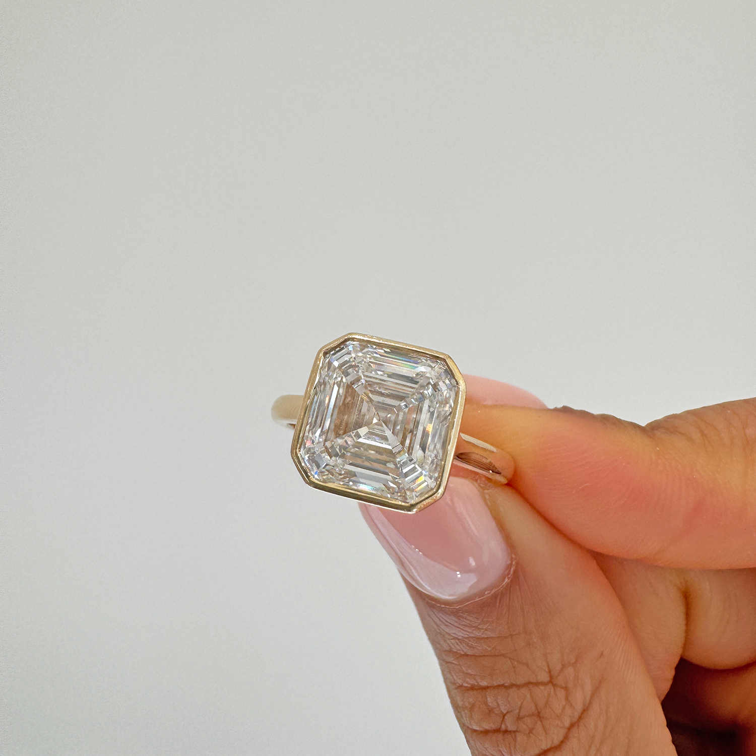 The Asscher cut is a vintage-inspired square diamond with deep step cuts and a high crown, creating a mesmerizing hall-of-mirrors effect. Perfect for lovers of clean lines and geometric elegance, MiaDonna’s Asscher rings feature lab grown diamonds—ethically made and environmentally conscious. Set in recycled 14K gold, these rings combine timeless Art Deco style with sustainable craftsmanship, making Asscher the ideal choice for a conscious, classic engagement ring.