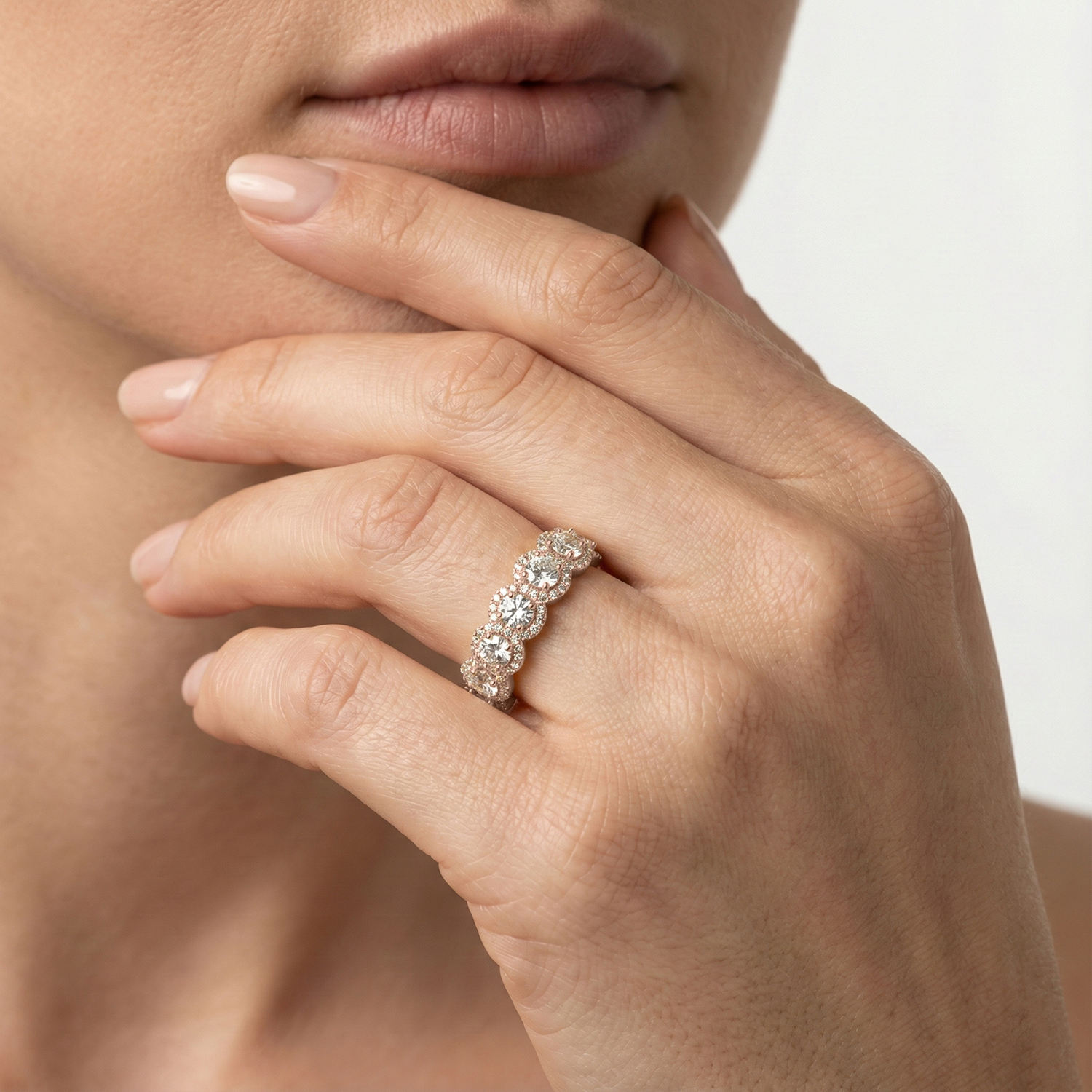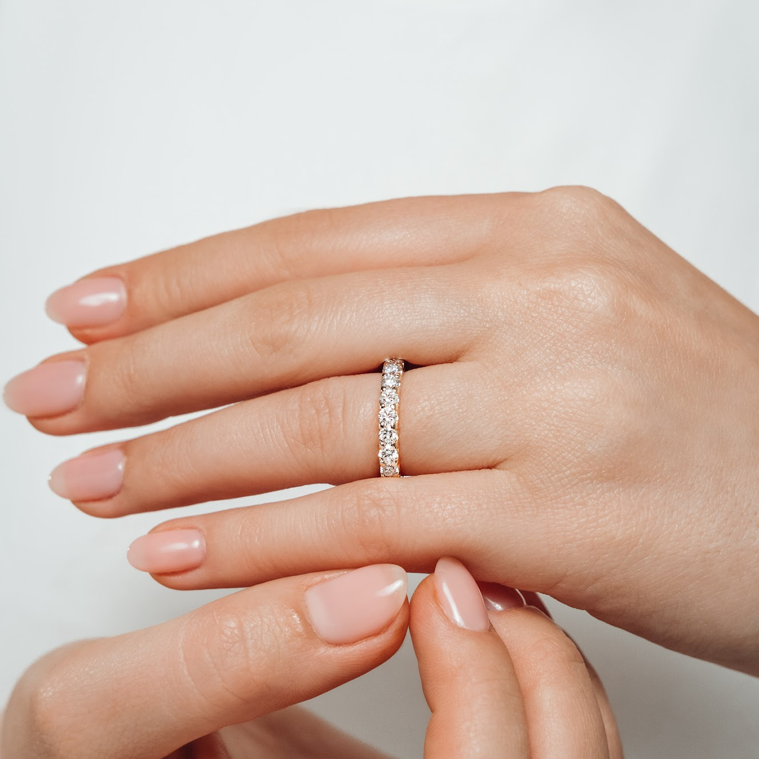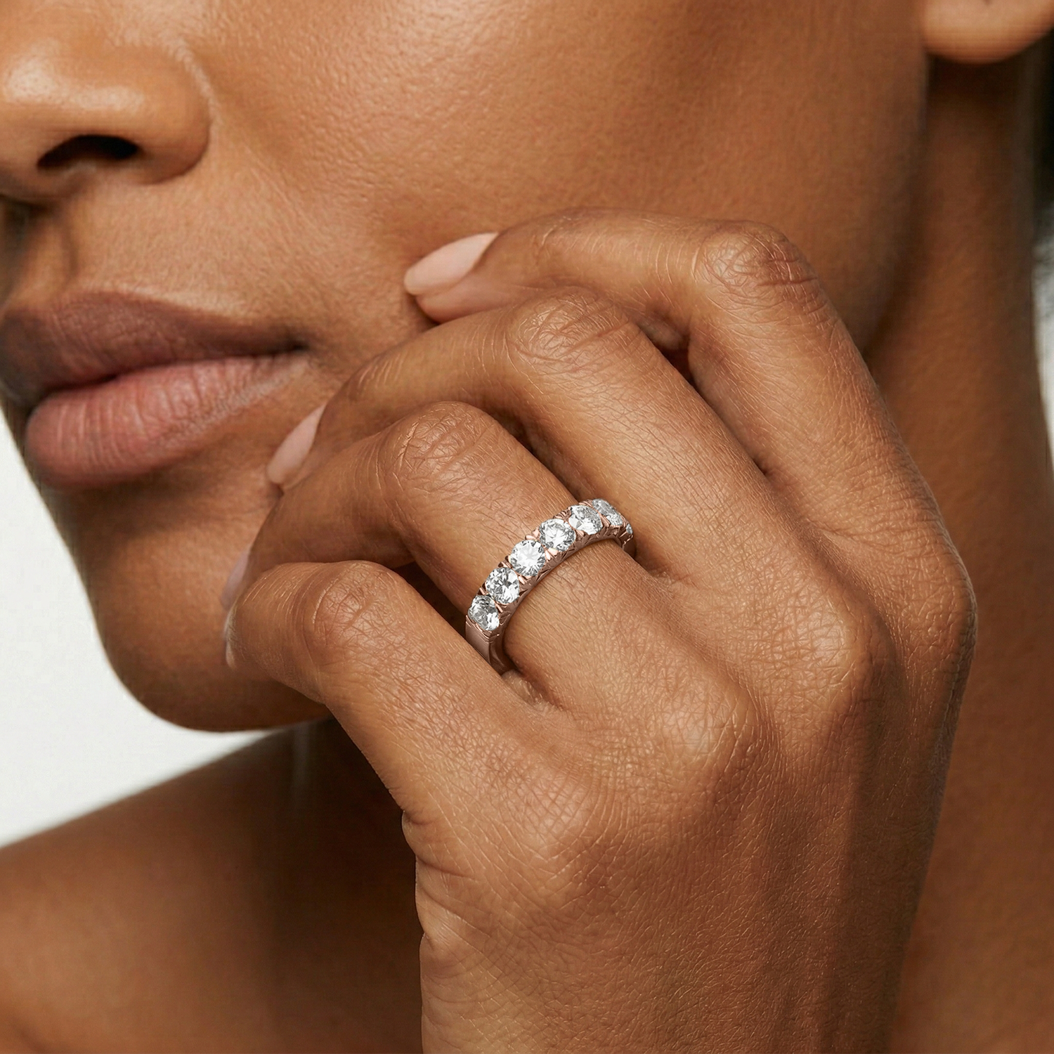 It depends on your style and lifestyle. Channel-set anniversary bands have a smoother profile that can feel more protected for daily wear. Four-prong and shared-prong settings can maximize light and sparkle, giving a more classic diamond-forward look.