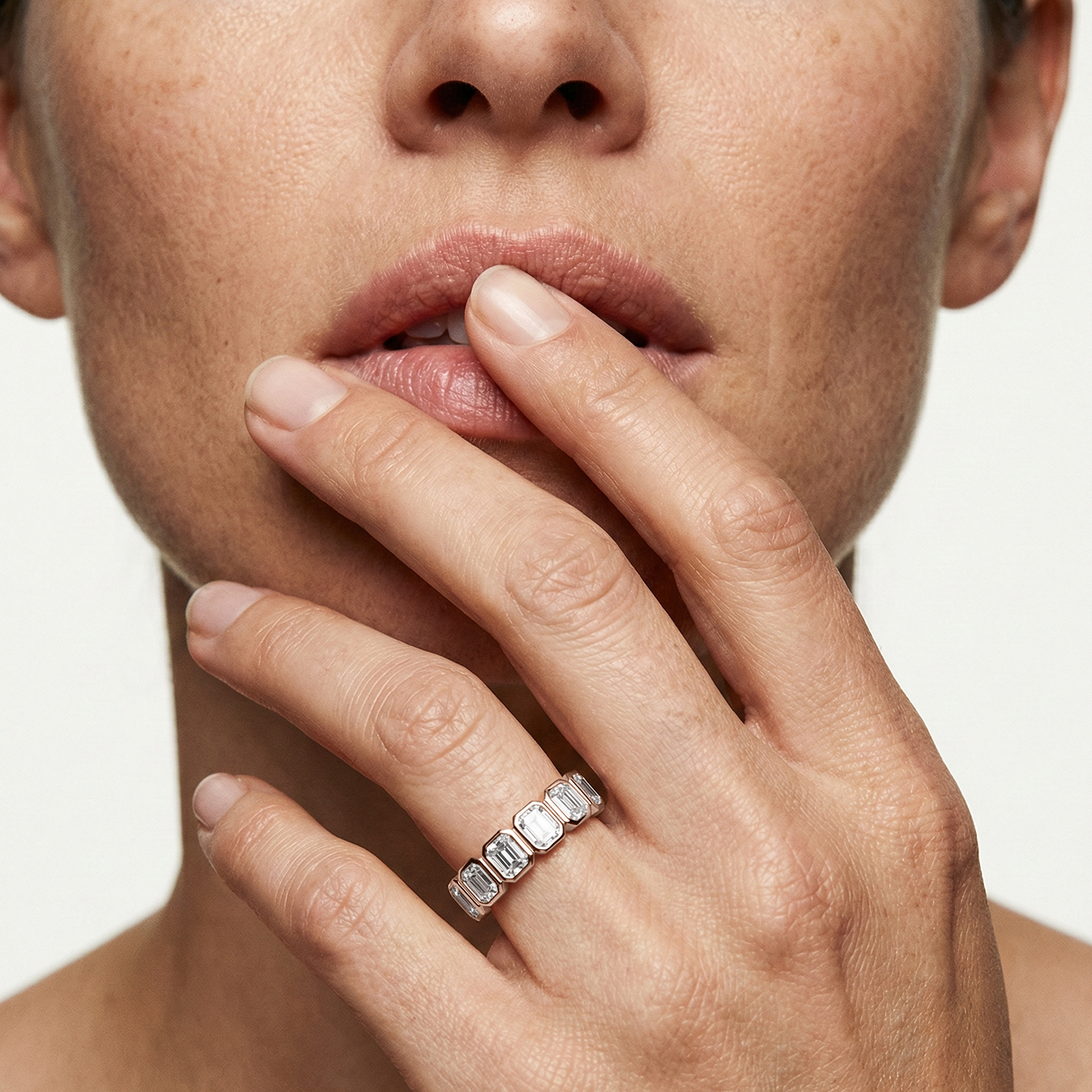 Emerald cut eternity band:Crisp lines and a tailored, editorial look.