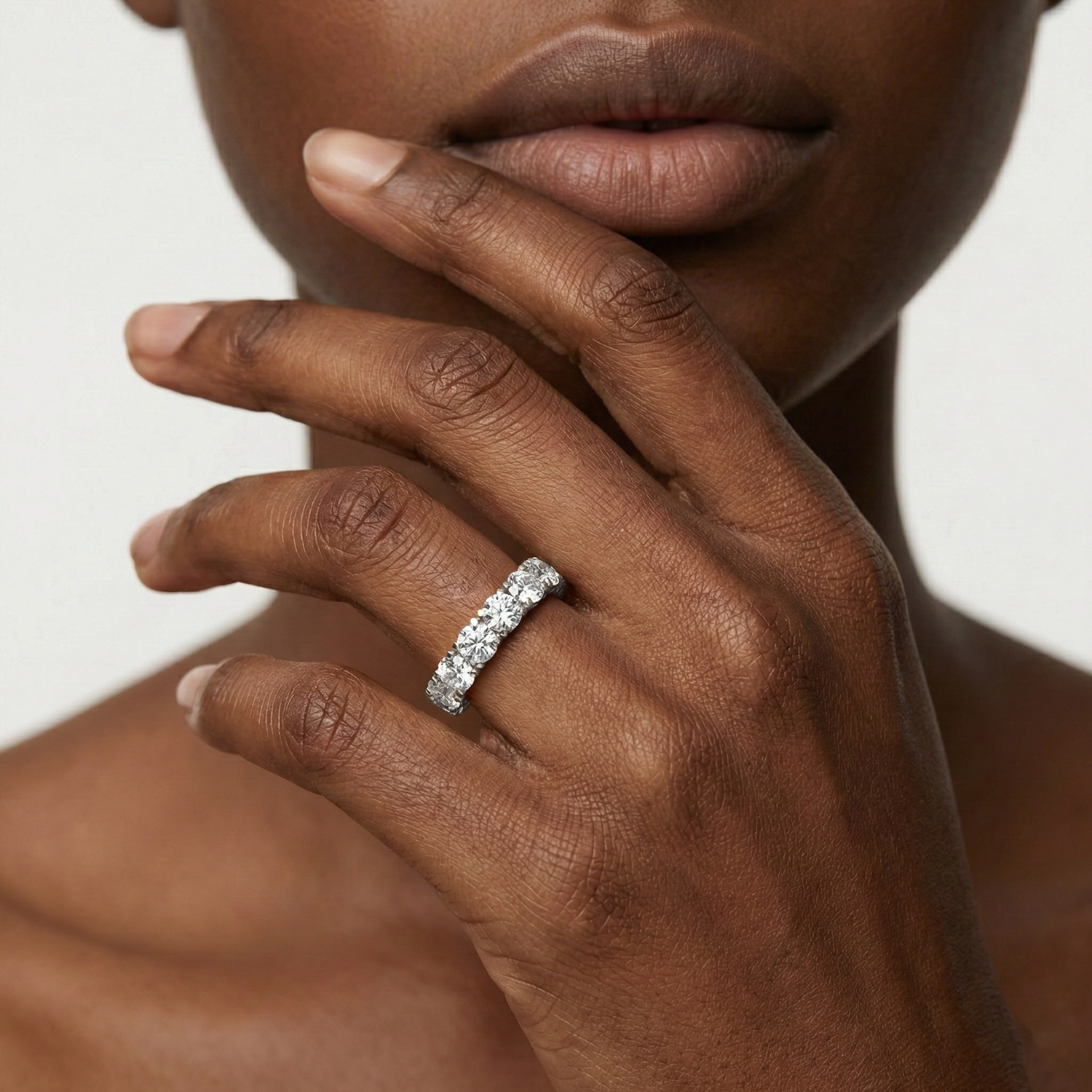Alternating eternity band:A curated mix—like round-and-baguette or oval-and-round—for a diamond eternity band that feels distinctive but still timeless.