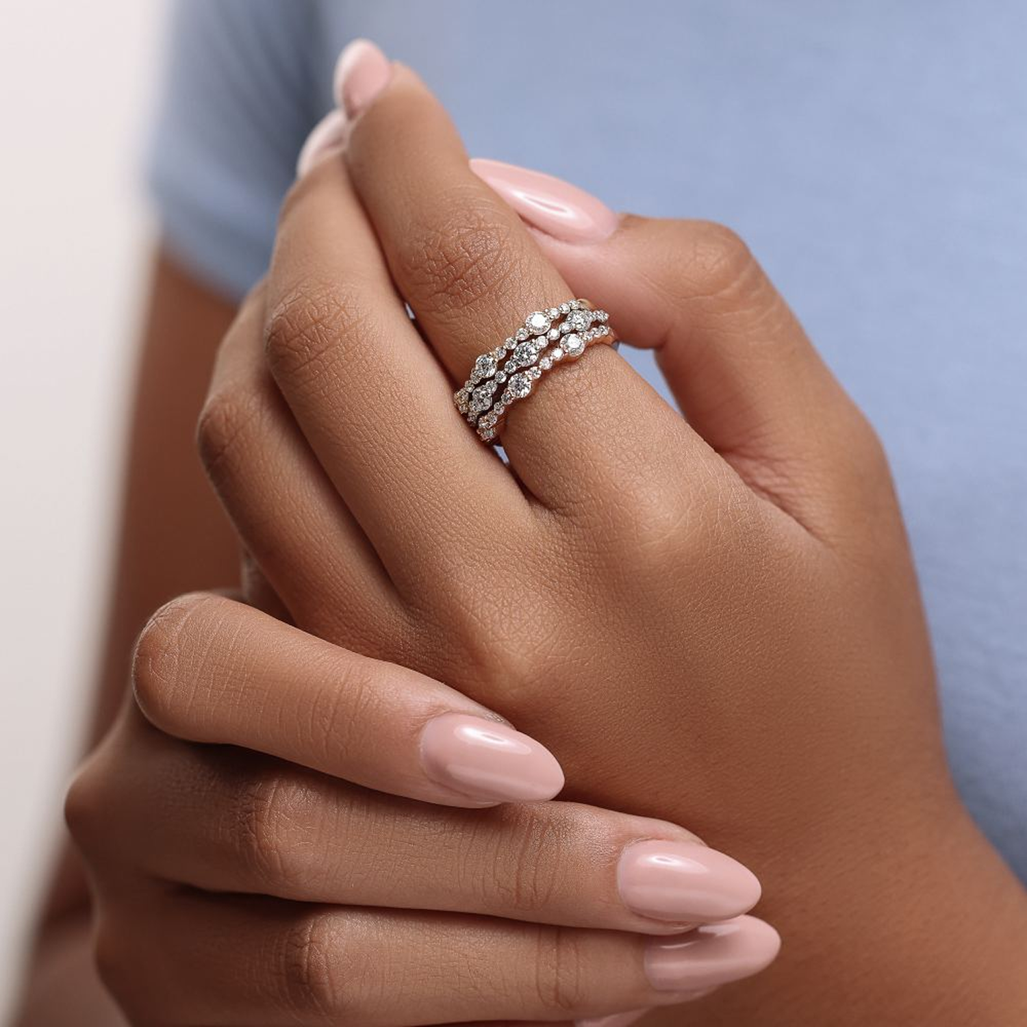 Stackable bands are rings meant to be worn together in a layered look. You can stack lab grown diamond bands, plain metal bands, or detailed designs to create a custom style you can change over time.