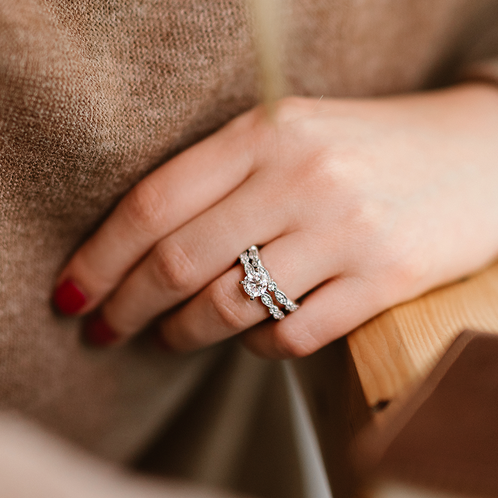 Yes – and the right band makes all the difference. MiaDonna offers wedding bands designed to sit beautifully alongside vintage-inspired engagement rings, with coordinating details like milgrain edging, filigree work, and contoured profiles that follow the shape of the ring.