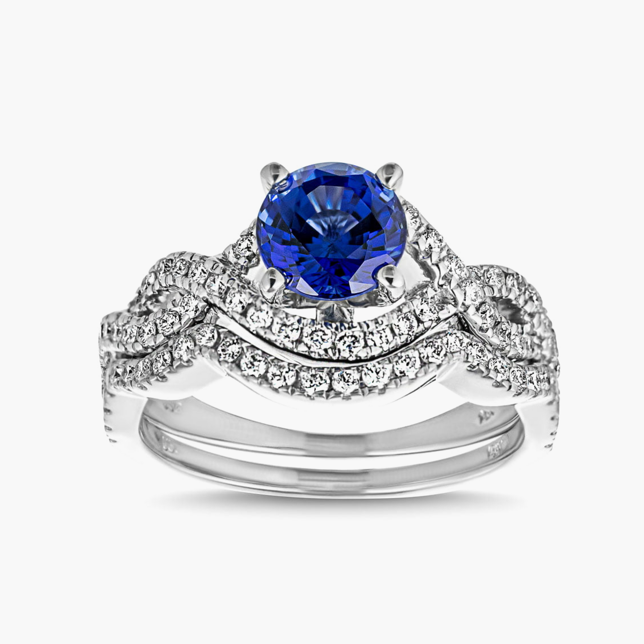 The beautiful Brianna Wedding Set comes with both the engagement ring and matching diamond accented wedding band. The Brianna Engagement Ring features a unique halo and twisted shank design, accented with prong set Lab Grown Diamonds. The Wedding Band is the exact match to the engagement ring, contouring to follow the lines of the engagement ring for a perfect puzzle fit. Starting price is for setting only.