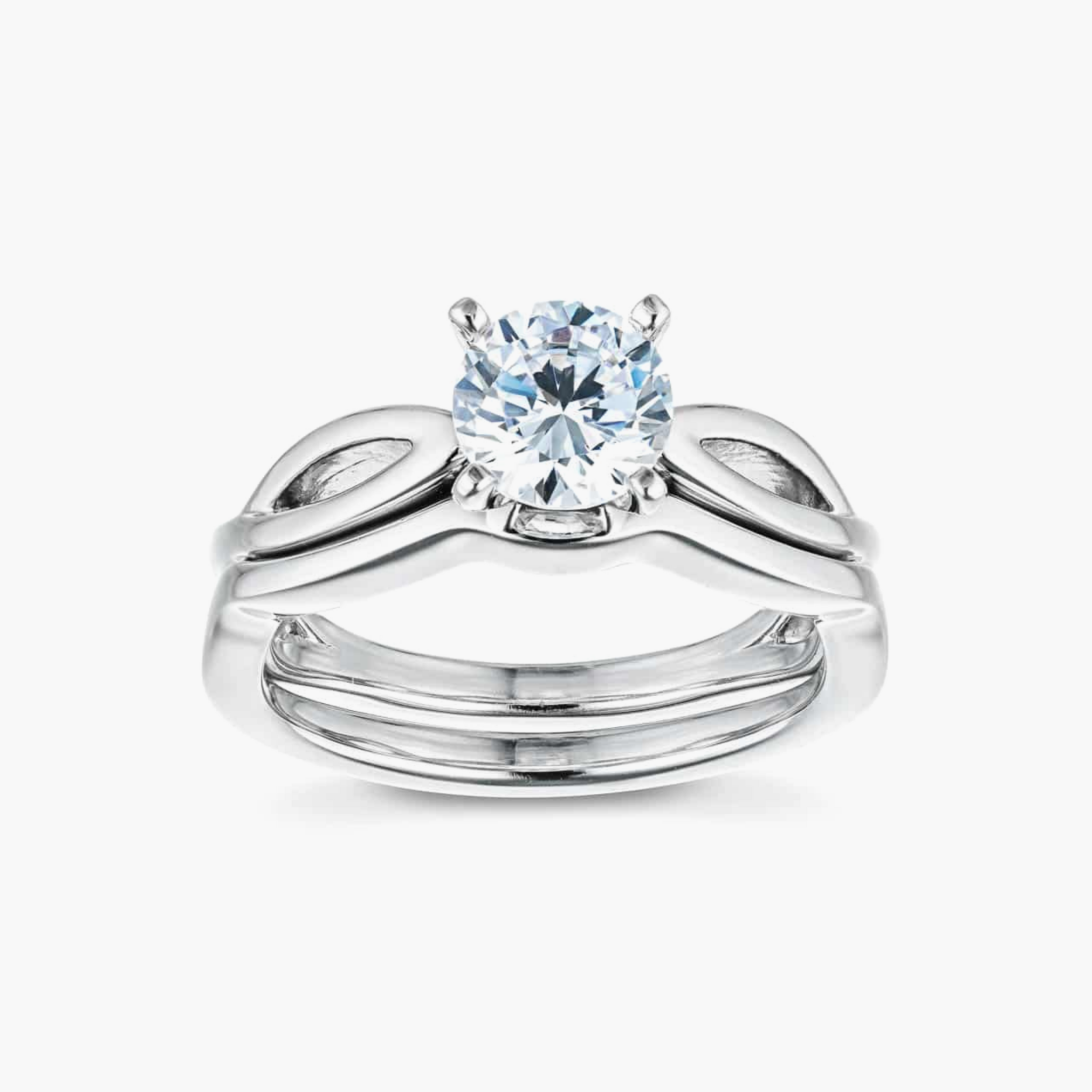 The Karina Wedding Ring Set features the Engagement Ring, which can be made with any size or shape center stone, and has a gorgeous twisted plain metal band that goes 3/4ths of the way around the ring. Add a matching band to either or both sides to complete this classic look. Starting price is for setting only.