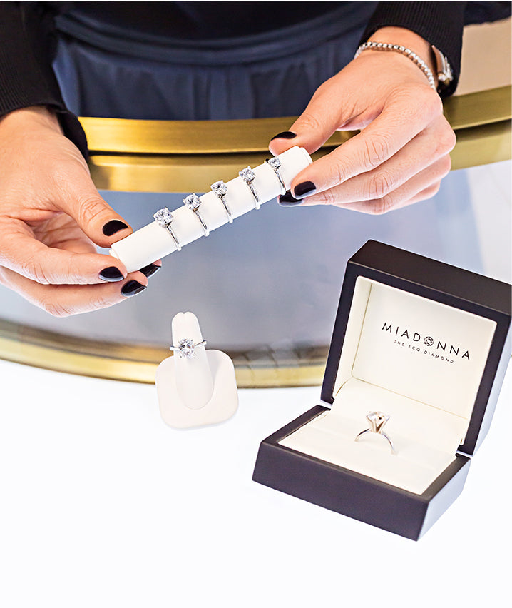 Our non-commissioned MiaDonna jewelry experts can assist you in choosing an engagement ring, answer your questions, and offer world-class personalized service, in-person or virtually.
