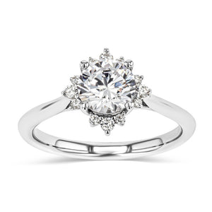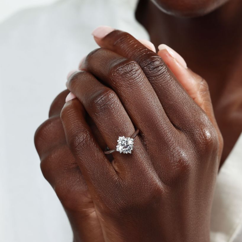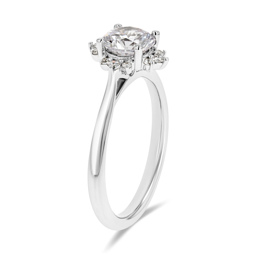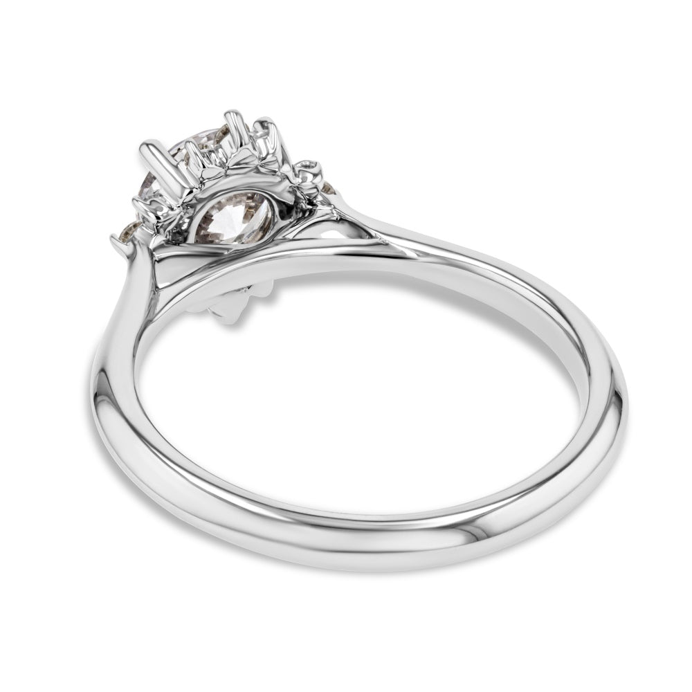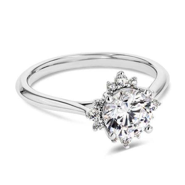 The Aura Engagement Ring features a star-shape halo of Lab Grown Diamonds on a plain metal band and set with the center stone of your choice. This ring can sit flush with any straight wedding band without taking up too much room on the finger.