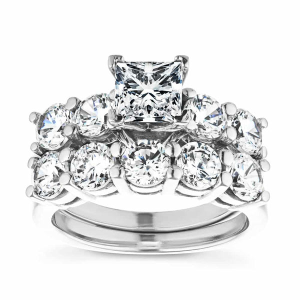 The Christine Wedding Set is a show stopper, featuring 2.25ctw side stones. The Engagement Ring comes set with 4 x 0.25ct Round Cut Lab Grown Diamond side stones and the matching Wedding Band comes set with 5 x 0.25ct Round Cut Lab Grown Diamonds. Starting price does not include center stone.