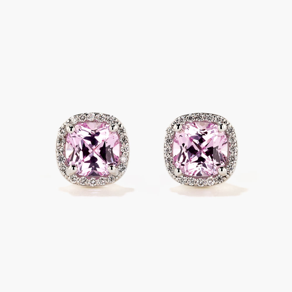 These Ready-to-Ship stunning Diamond Halo Earrings feature 3.0ctw Cushion Cut Lab Created Light Pink Champagne Sapphire Gemstones accented by a halo of Lab Grown Diamonds, crafted in 14K White Gold. All ready to ship Items are available for return/exchange as long as they are not resized or altered in any way.