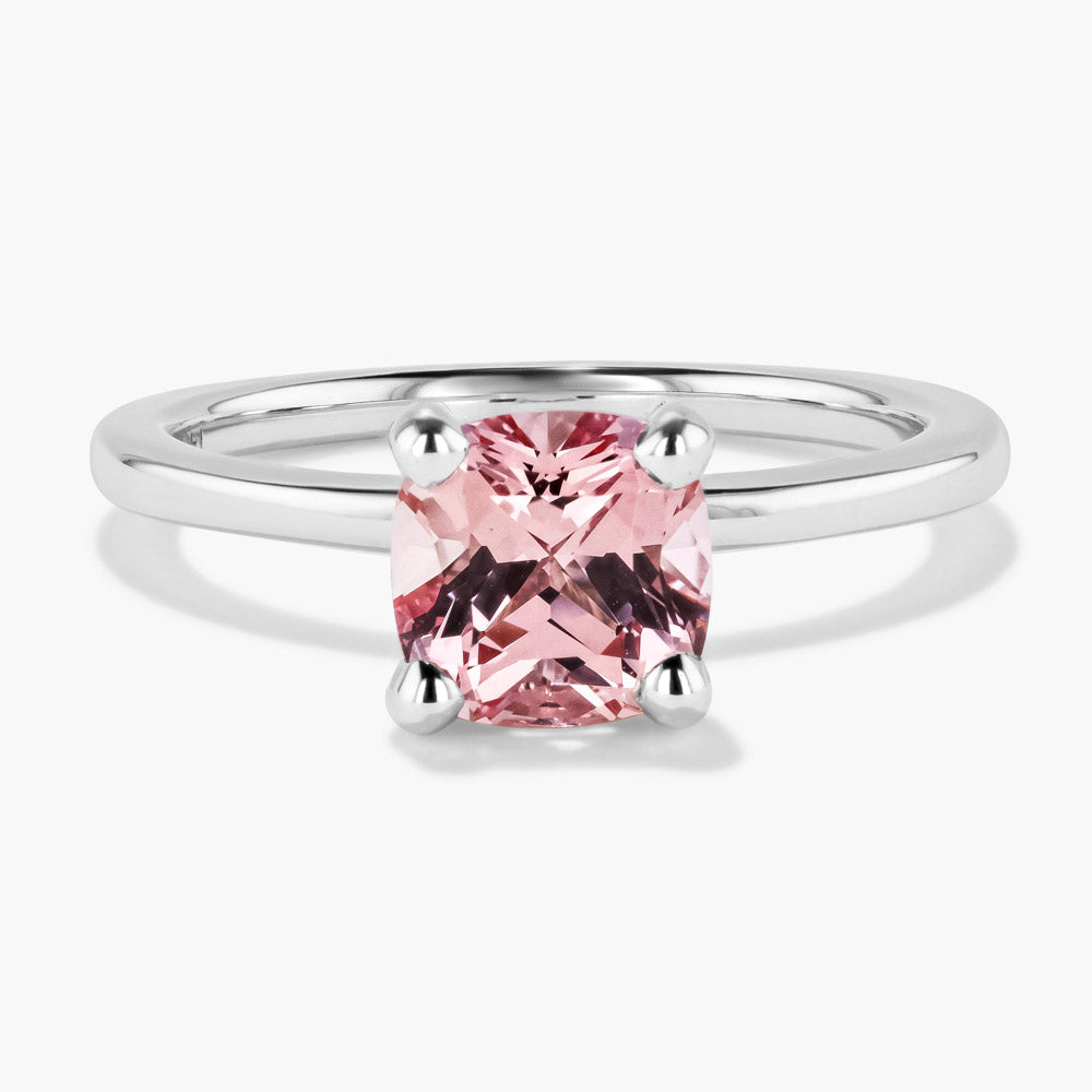 This Ready-to-Ship Custom Adelaide Engagement Ring is set with a 1.29ct cushion cut Champagne Sapphire center stone with recycled melee diamonds in a hidden halo and accenting the prongs. It features a plain band in 14K recycled White Gold in a ring size 4.25 (selecting any other size will result in resizing). All Ready-to-Ship items are available for return/exchange as long as they are not resized or altered in any way.
