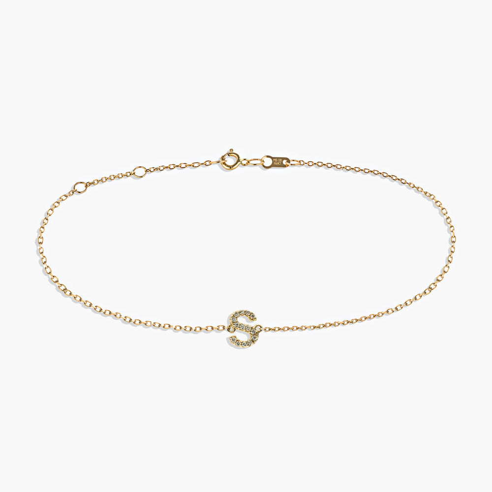This Diamond Initial Bracelet features an "S" accented with 0.10ctw recycled diamonds on a 7-inch chain and is crafted in 14K recycled Yellow Gold.