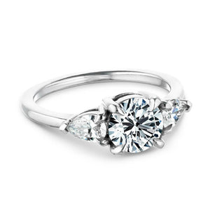 The Emery Three Stone Engagement Ring features a Round Cut center stone accented with two 0.30ct (0.60ctw) Pear Cut Lab Grown Diamond side stones in a basket setting, atop a petite smooth metal shank. Starting price is for setting only.