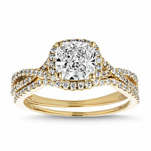 The Eternal Monogram Wedding Set allows you to create something truly unique by adding your initials beneath the center stone in the basket. You can customize with any three letters of your choosing. This ring comes set with a beautiful Cushion Cut center stone surrounded by a halo of Lab Grown Diamonds, which continue down the twisted shank. The curved wedding band is a perfect fit to the engagement ring. Starting price is for setting only.