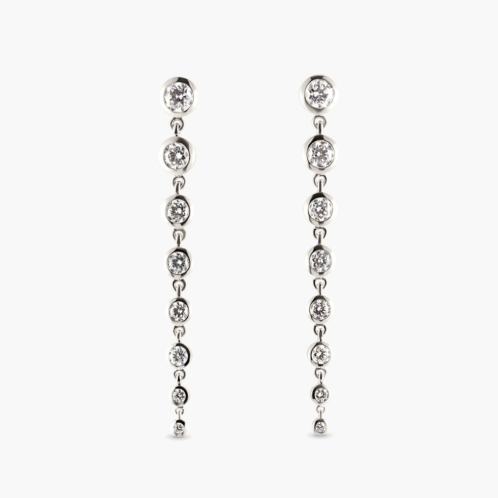 These Ready-to-Ship Graduated Lab Grown Diamond Bezel Drop earrings containing 1.75ctw of VS clarity F color Diamonds in 14k White Gold. Perfect for adding sparkle to any occasion! All Ready-to-Ship items are available for return/exchange as long as they are not resized or altered in any way.