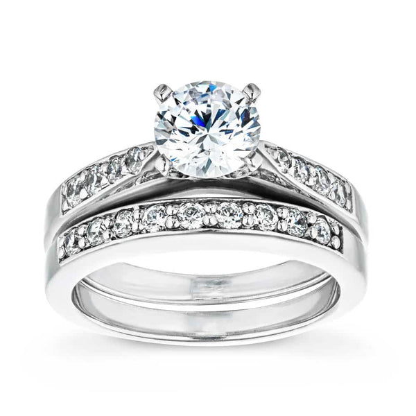 For clean lines and classic styling, the Helen Wedding Set is the perfect choice. The gorgeous Wedding Ring is channel set with recycled diamonds along the top of the band, tapering as it meets the center stone, spacing the ring out slightly when paired with the matching Wedding Band. Starting price is for setting only.