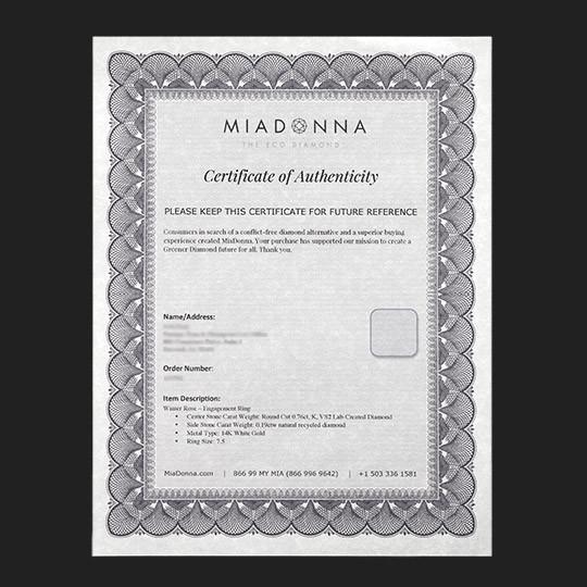 Any and all claims must be made directly with MiaDonna.com and must be accompanied by your original sales receipt and certificate of authenticity. We may discontinue shapes or sizes and cannot guarantee a replacement of the exact size and shape will be available. One guarantee replacement per stone/per order.