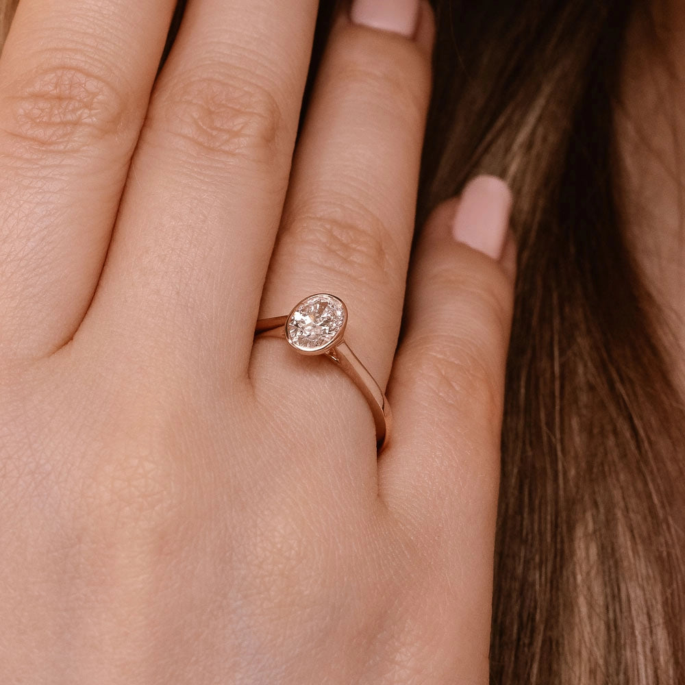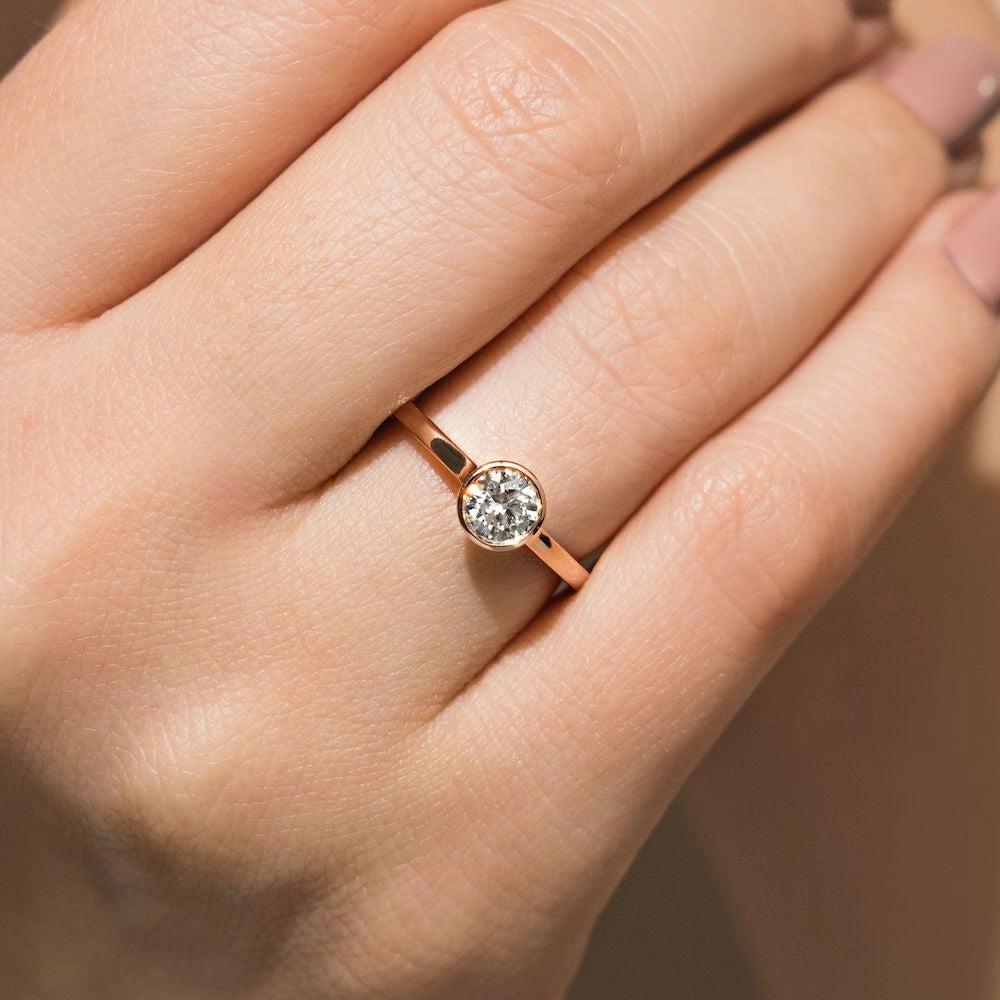 The Lilac Bezel Set Lab Grown Diamond Ring features a thin bezel halo surrounding a G/H Color VS Clarity Lab Grown Diamond center stone of your choice on a petite plain metal band.