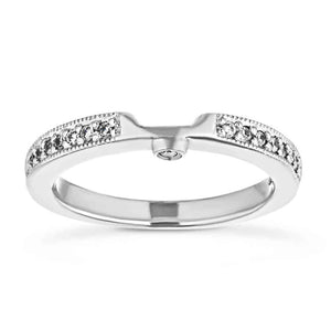 This design features your choice of the Cushion Cut center stone bezel set in a beautiful antique milgrain halo of Lab Grown Diamonds that continue below the center stone and halfway down the shank. The Wedding band has perfectly matching details to the engagement ring, with a slight notch so it sits flush. Starting price is for setting only.