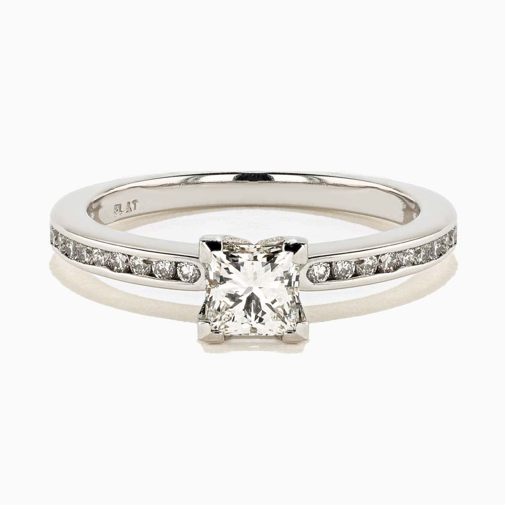 The Drew Engagement Ring is set with a 0.57ct I color, VS2 clarity princess cut Lab Grown Diamond center stone in Platinum, Ring Size 6.75 (any other size will require resizing). All sale items are available for exchange only as long as the item has not been re-sized or altered in any way.
