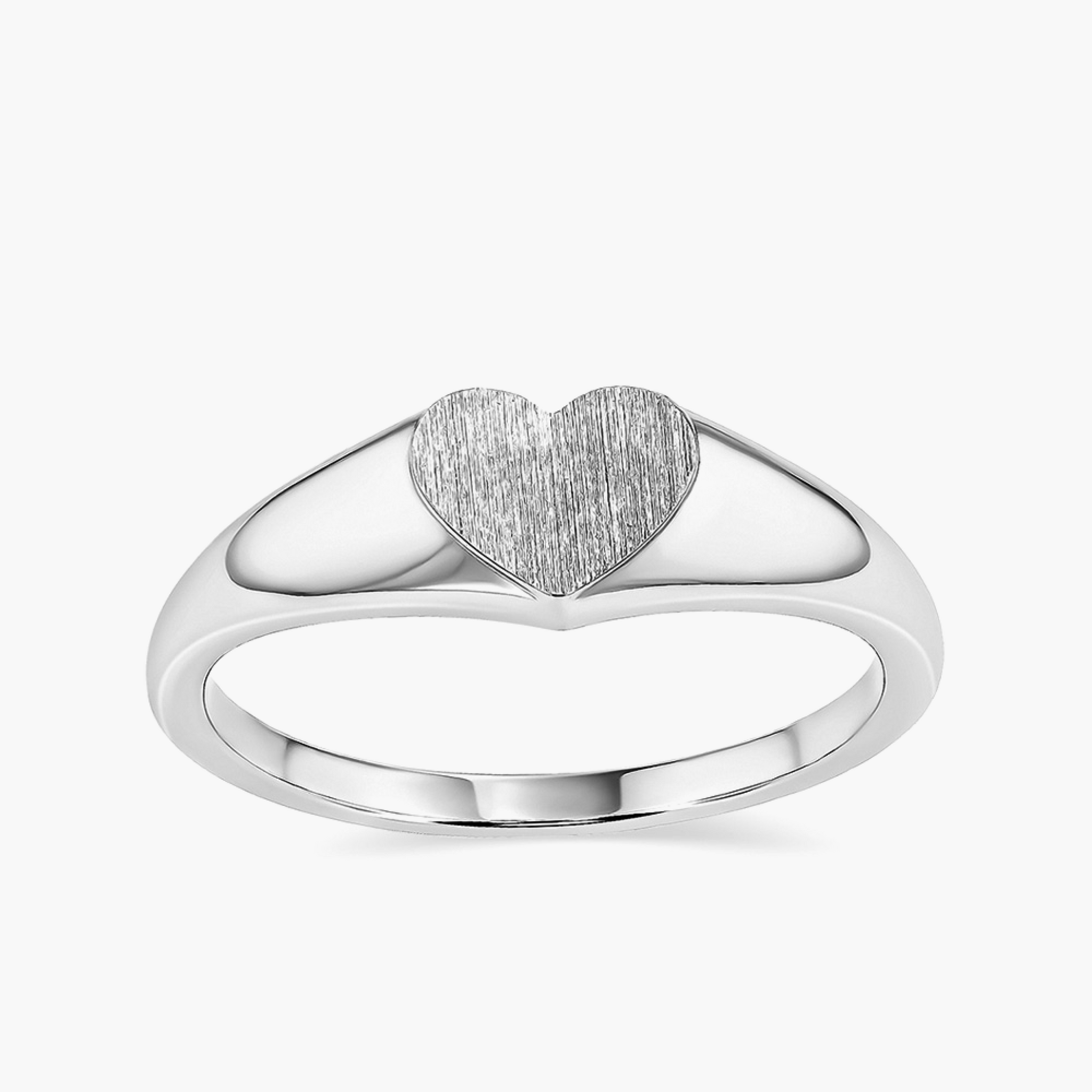 The Heart Signet Ring is a personalized statement piece that will last a lifetime, featuring a thick plain metal ring with an engravable heart shaped center in the metal of your choice. The band tapers down to 2mm in the back, and the heart is approx. 6.4mm wide.