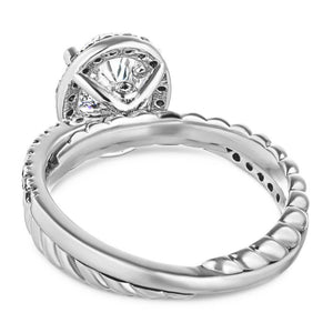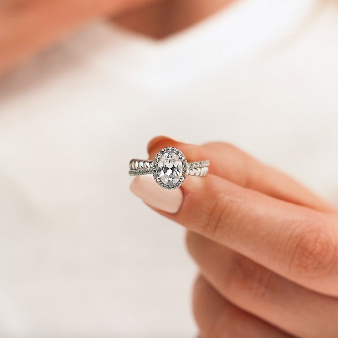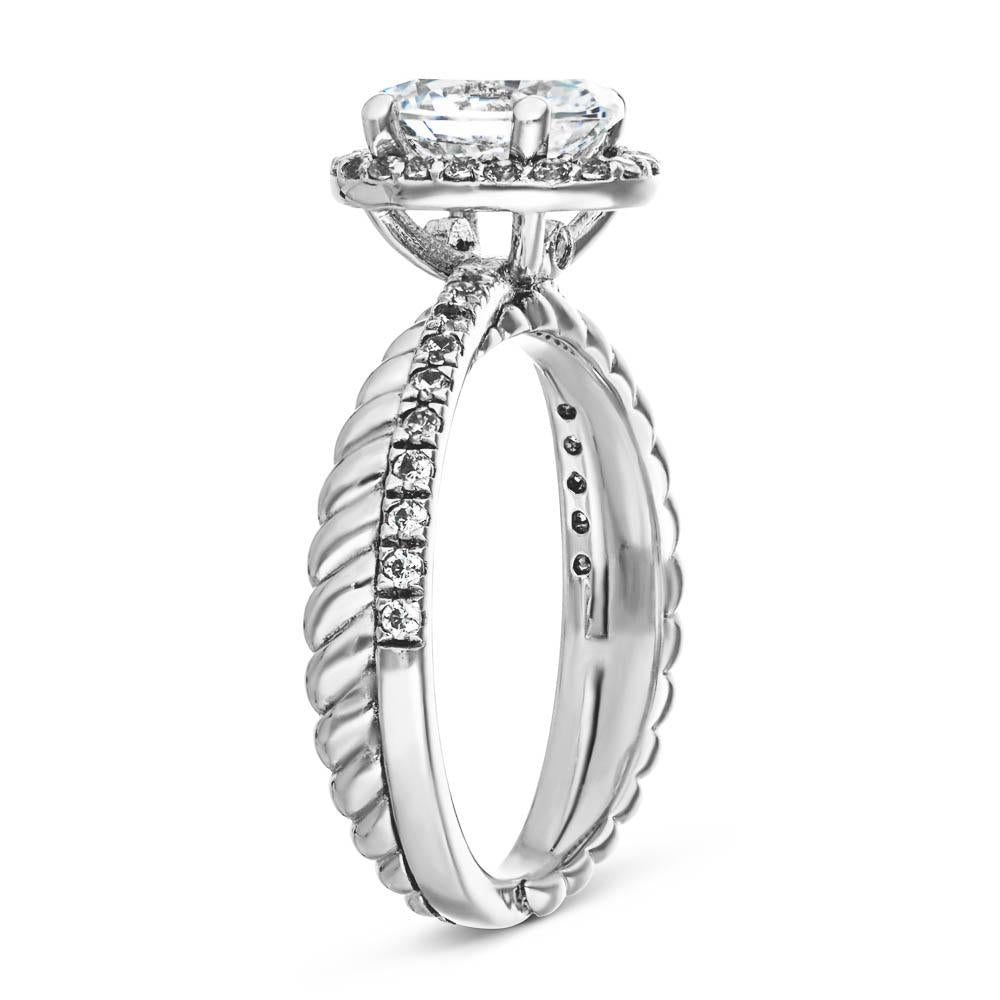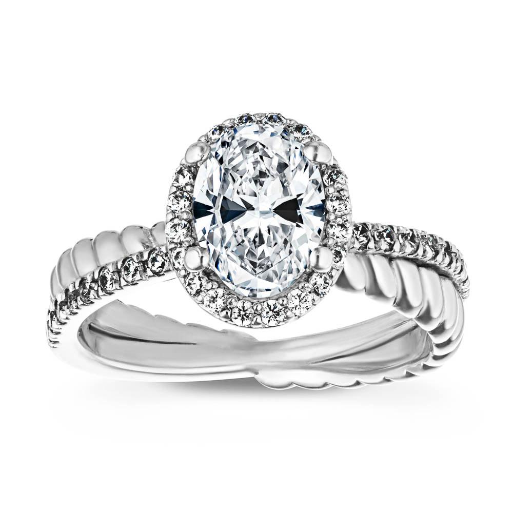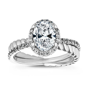 This ring features an Oval Cut center stone in a halo of Lab Grown Diamonds. The twisted two-tone shank features a rope design on one band, and Lab Grown Diamonds going halfway around on the second. Starting price is for setting only.