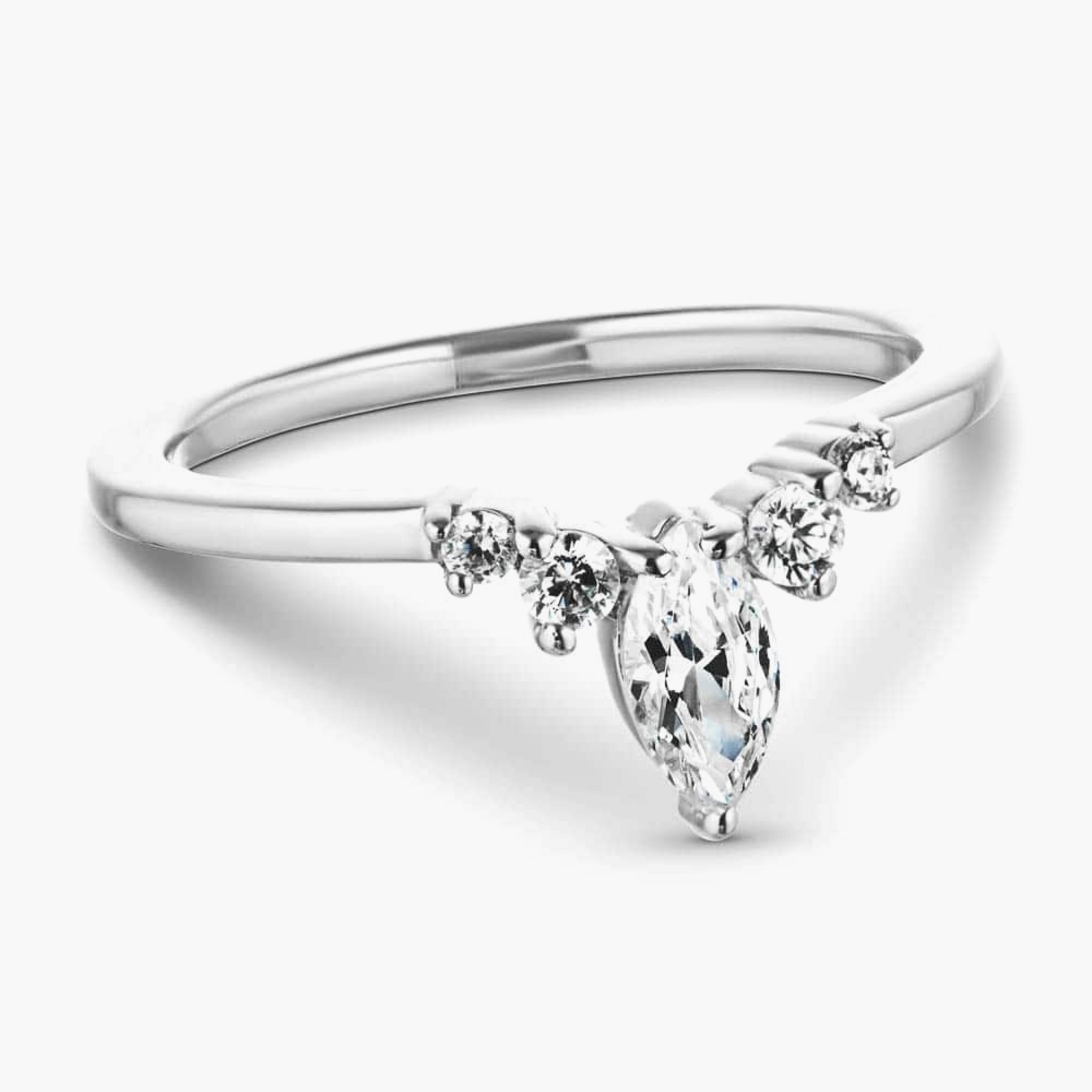 The Tiara Wedding Band is gorgeous as a stand alone ring, or as an accent to a more traditional engagement ring. The center Marquise is a 0.30-0.33ct H-J, VVS-VS quality Lab Grown Diamond, with 2 x Lab Grown Diamonds on either side.