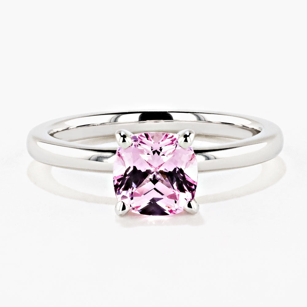 The Ready to Ship Traditional Solitaire Engagement Ring is set with a 1.50ct Cushion Cut Pink Champagne Sapphire Lab Created Gemstone center stone in 14K White Gold, Size 5.25. (any other size selected will require resizing). All Ready to ship Items are available for return/exchange as long as they are not resized or altered in any way.