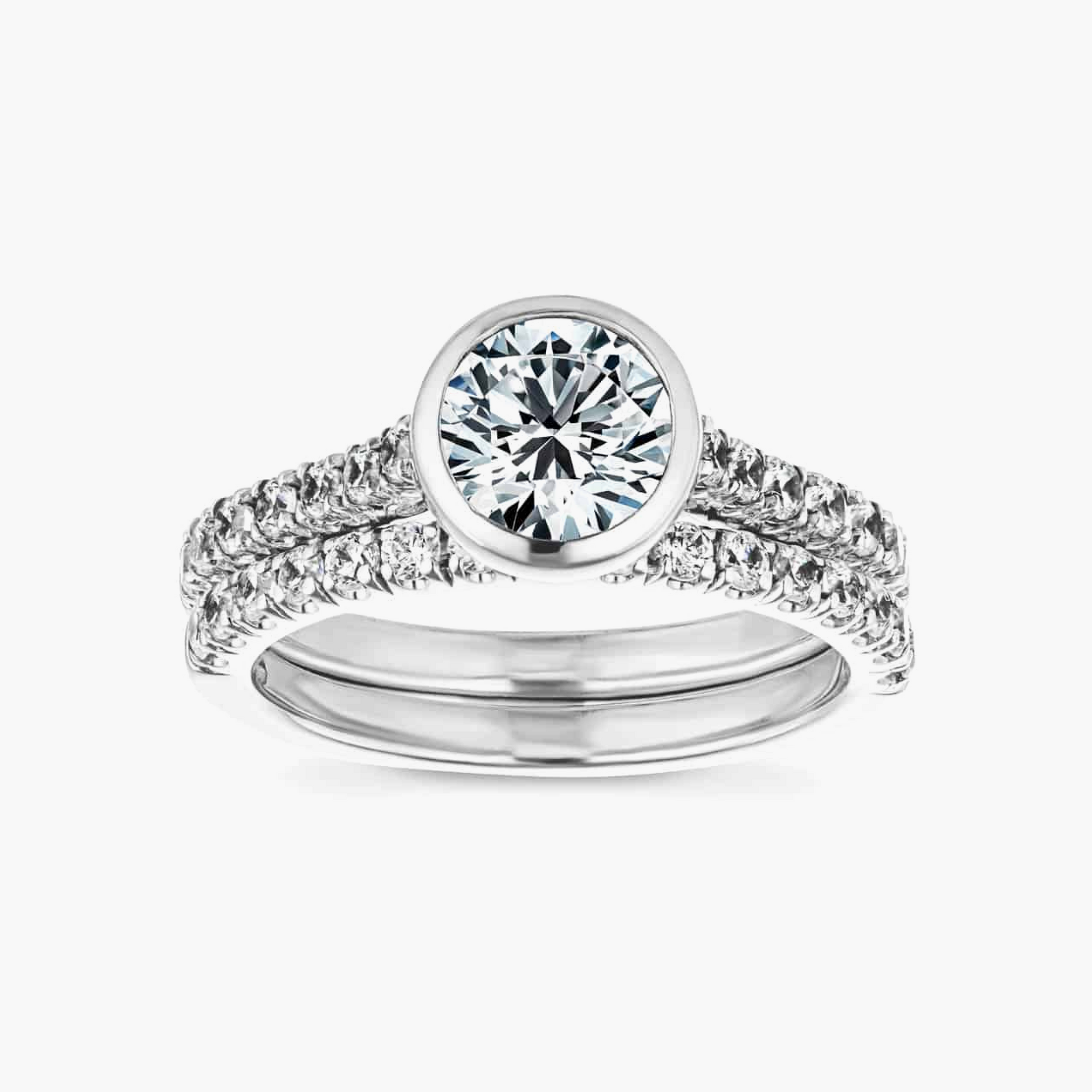 The Sofia Stackable Ring Set features the engagement ring with a smooth low profile bezel setting for your Round Cut center stone, and Lab Grown Diamonds accenting the shank. This ring's flat sides allow it to sit flush with the Sofia Stackable Band or any other straight band. Start building your ring to view matching stackable bands. Starting price is for setting only.